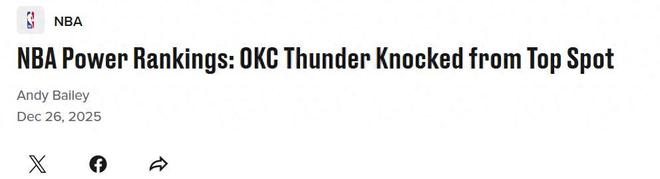 火箭跌至第6!NBA实力榜更新:湖人9勇士13马刺抢走雷霆第一宝座